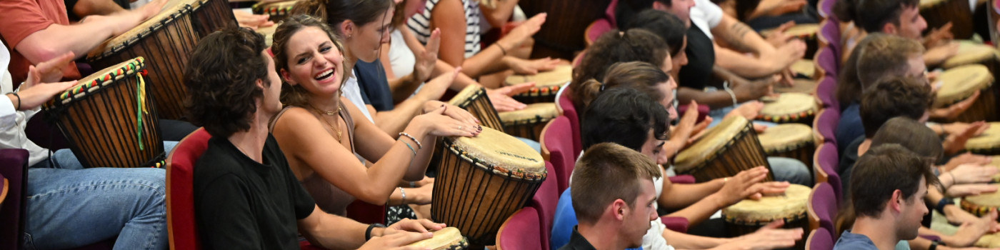 The amphitheatres in Reims on 4 September and Rouen on 5 September were filled with frenetic energy. For the start of the academic year in the 2023 Master in Management Programme, NEOMA organised a collective djembe drumming session. On the stage, four musicians led the audience in playing the instrument. It was the perfect occasion to focus on team work, the role and complementarity that each person has in a group or company, listening skills, inclusion, each person’s purpose and more.